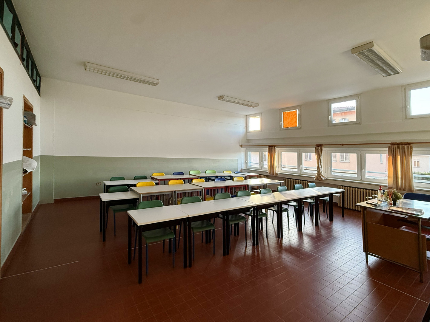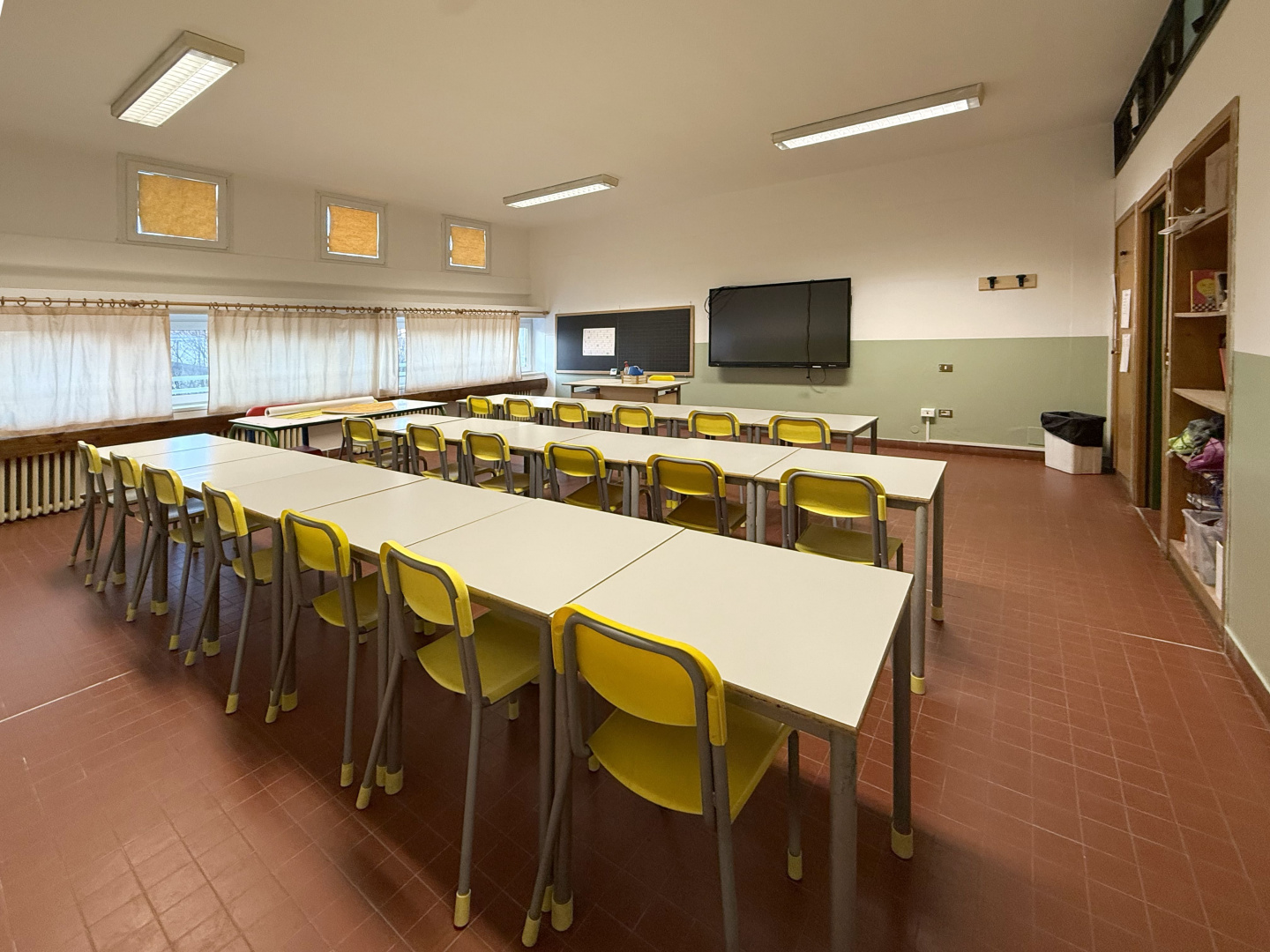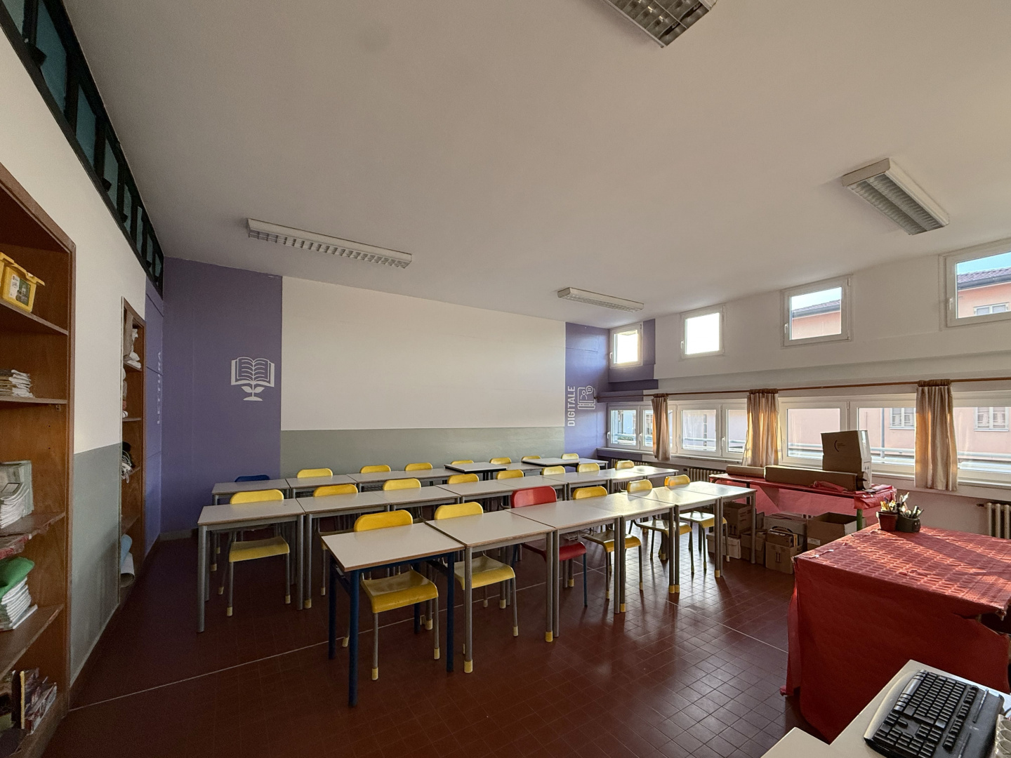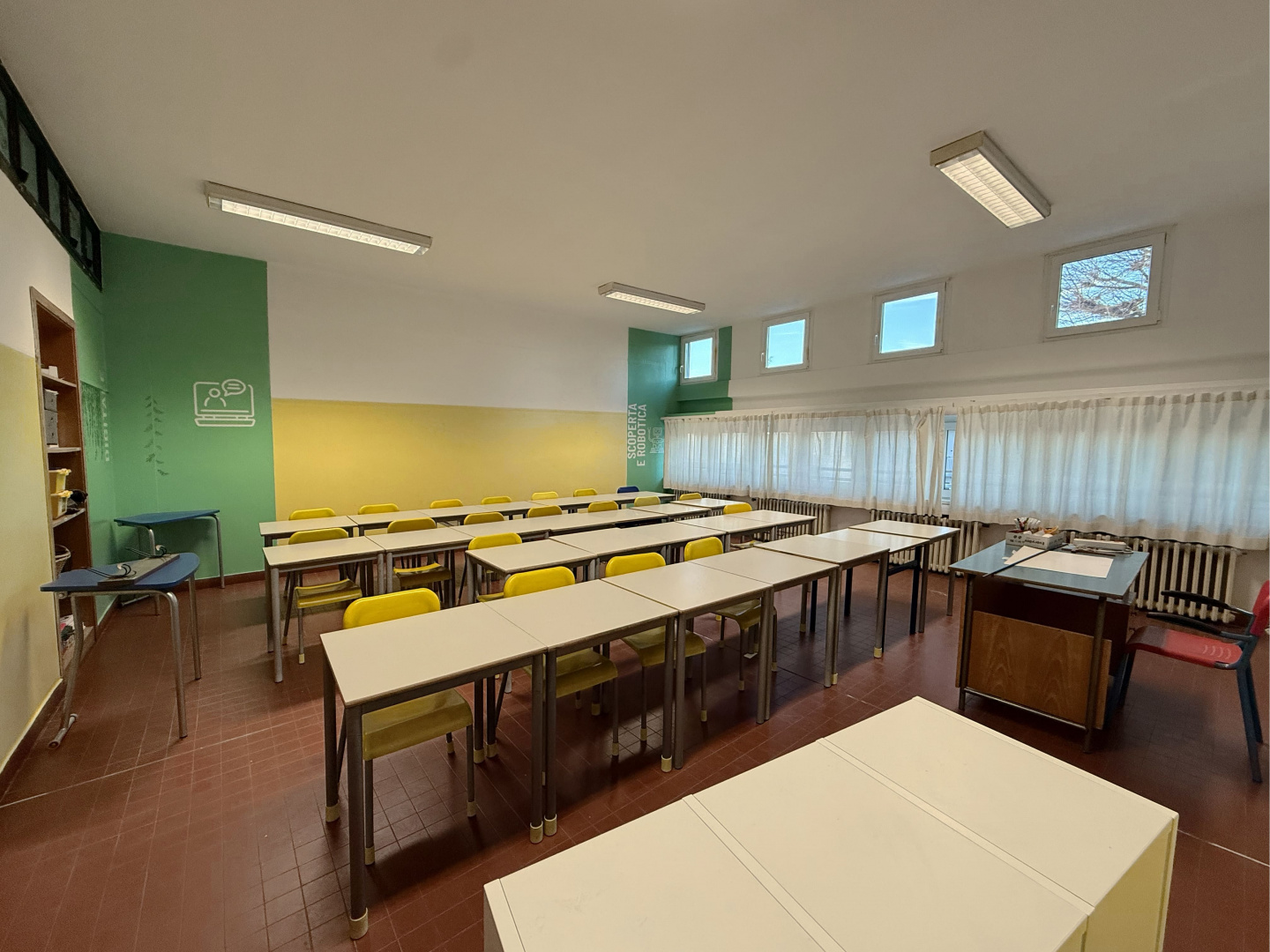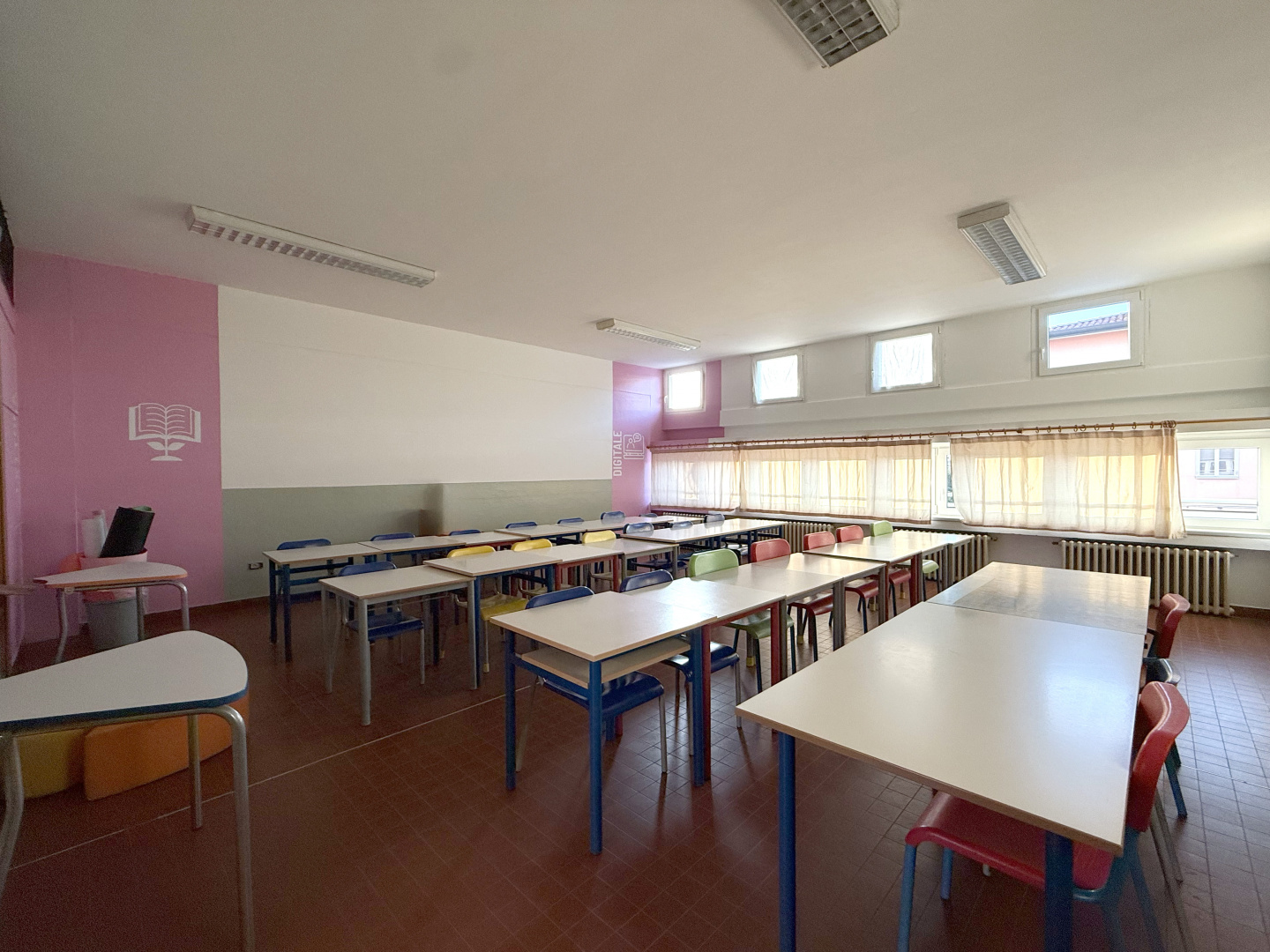 Les surfaces murales ont été traitées avec des revêtements Isocolor dans différentes couleurs, afin de caractériser les espaces intérieurs et rendre les environnements plus accueillants, lumineux et fonctionnels pour les élèves et les enseignants, tout en garantissant des surfaces lavables et résistantes à l’usure typique des bâtiments scolaires à forte fréquentation.