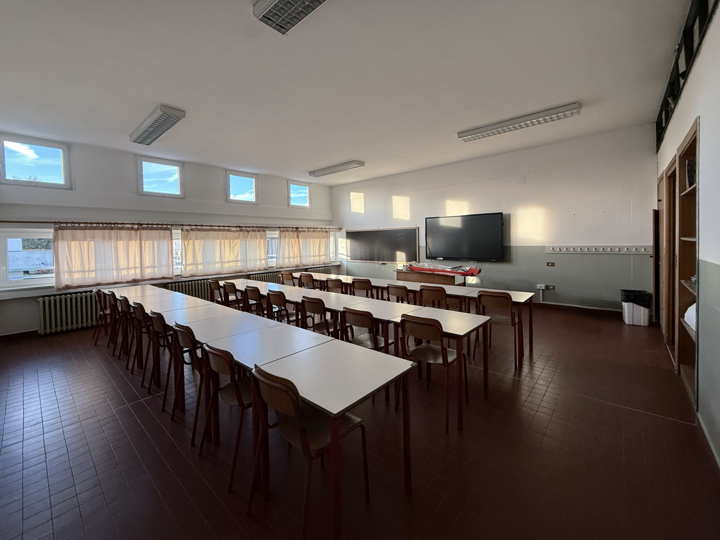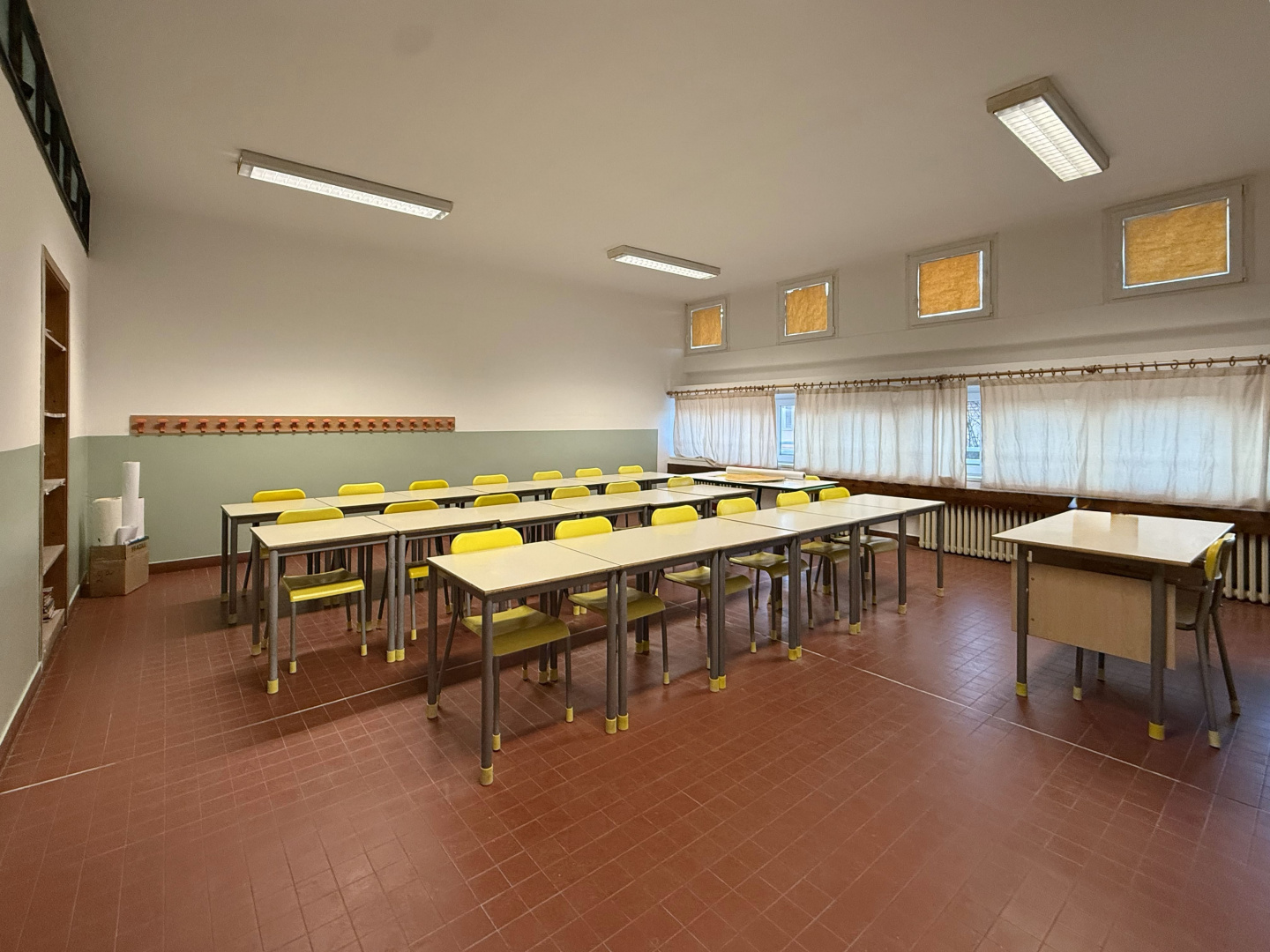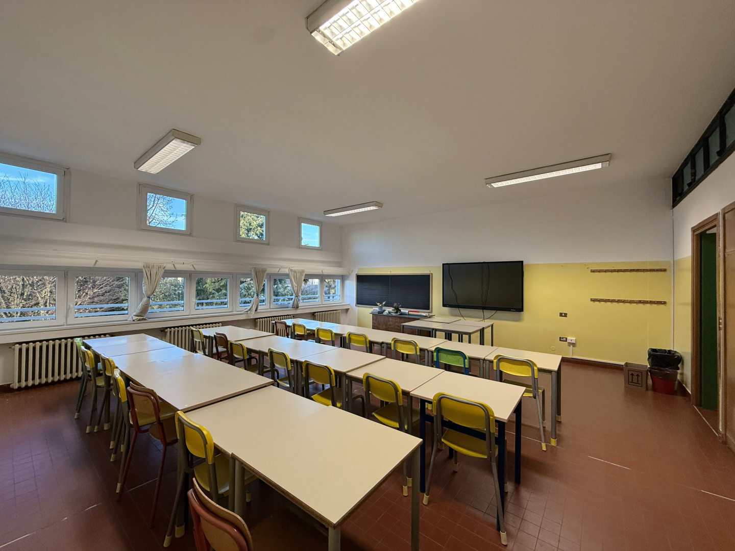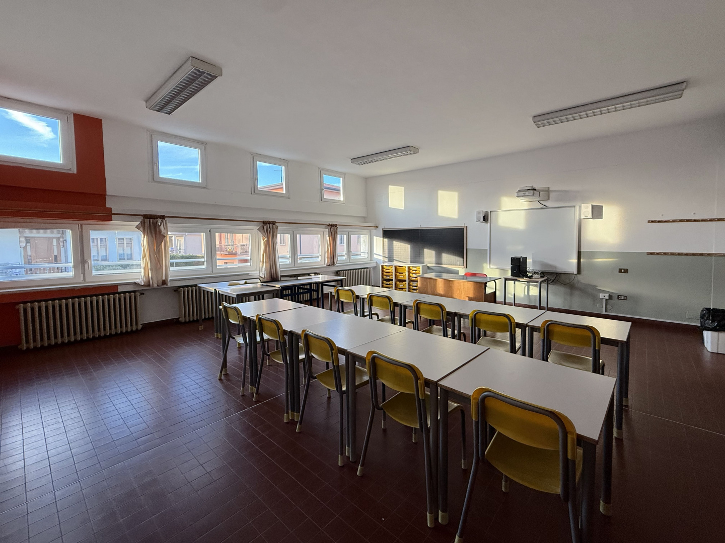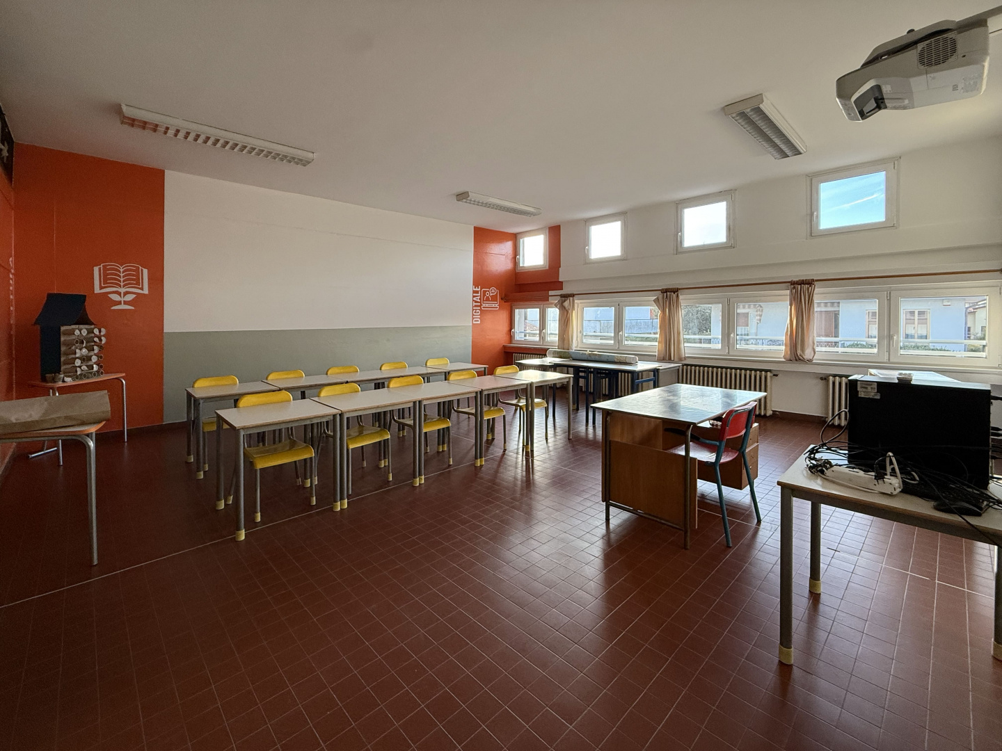 Les surfaces murales ont été traitées avec des revêtements Isocolor dans différentes couleurs, afin de caractériser les espaces intérieurs et rendre les environnements plus accueillants, lumineux et fonctionnels pour les élèves et les enseignants, tout en garantissant des surfaces lavables et résistantes à l’usure typique des bâtiments scolaires à forte fréquentation.